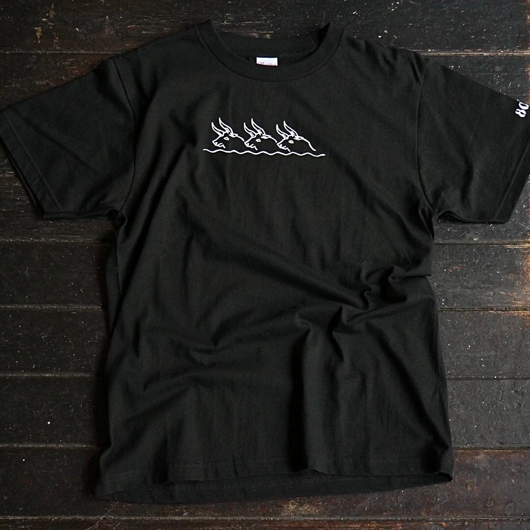 厚手のしっかりとした生地なのでバリスタがガンガン着てガシガシ洗濯しても簡単にはヨレません。敢えてラフにデザイン/プリントされたTシャツは古着との相性も良いと思います。3匹の水牛がデザインされています。